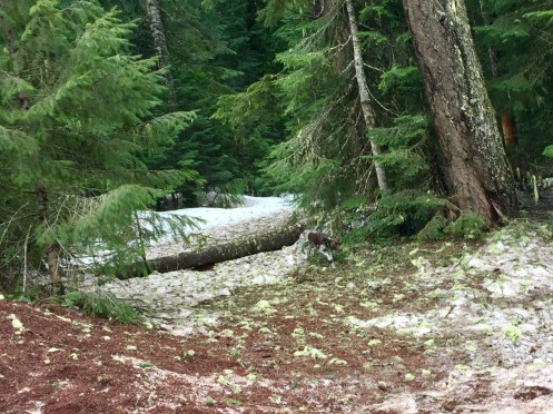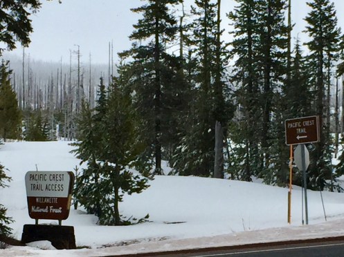 3-5 miles from the top of the pass, grades were 5-8%, a perfect time to offload 75 lbs. and let Jax walk. However, traffic was really roaring by now, so he remained in his chariot. Traffic was heavy, but very polite. We even got a few honks and thumbs up as we slogged up the final miles. That was really motivating! When we reached the Pacific Crest, I was really sweaty and it was starting to snow.
