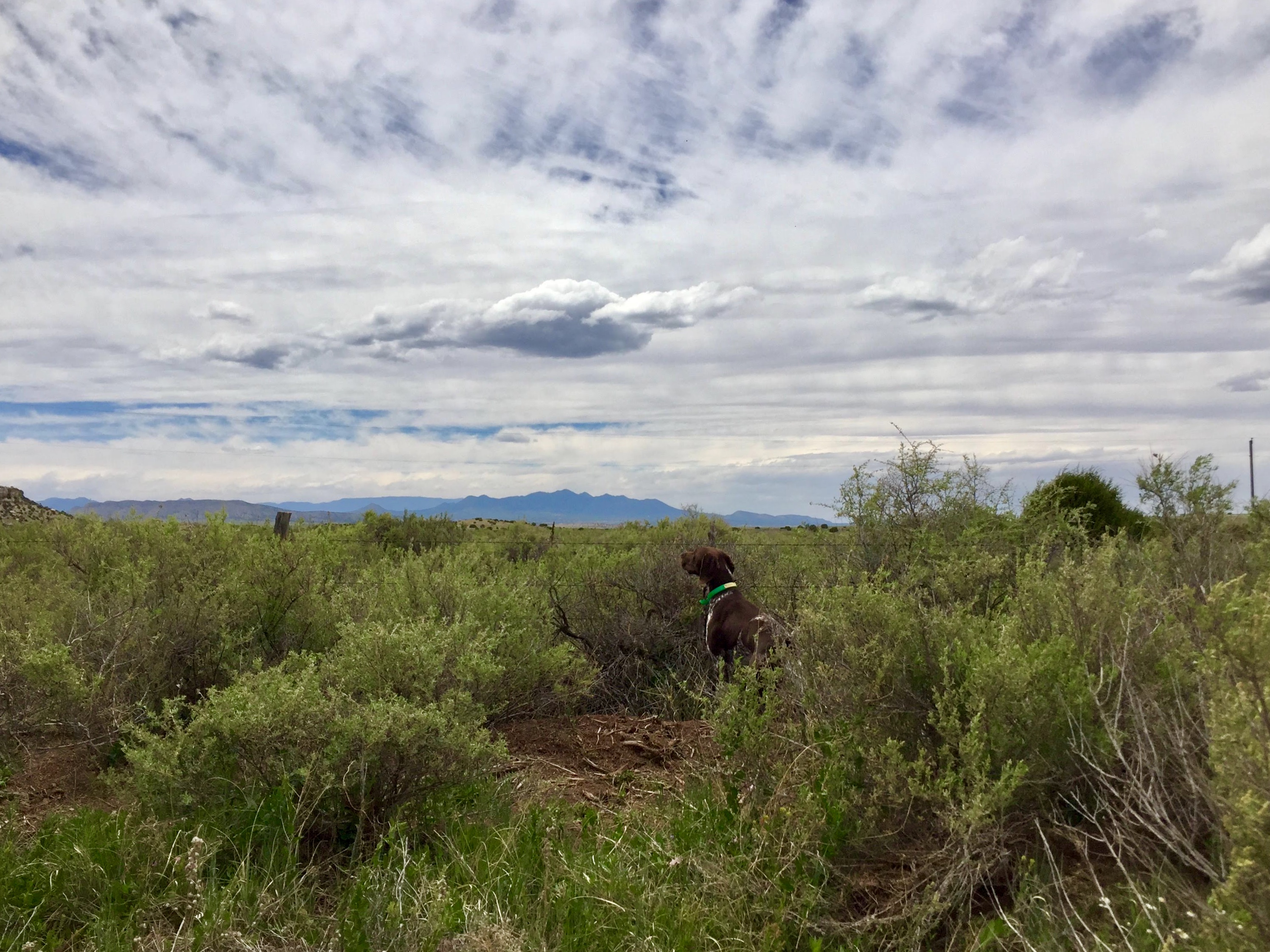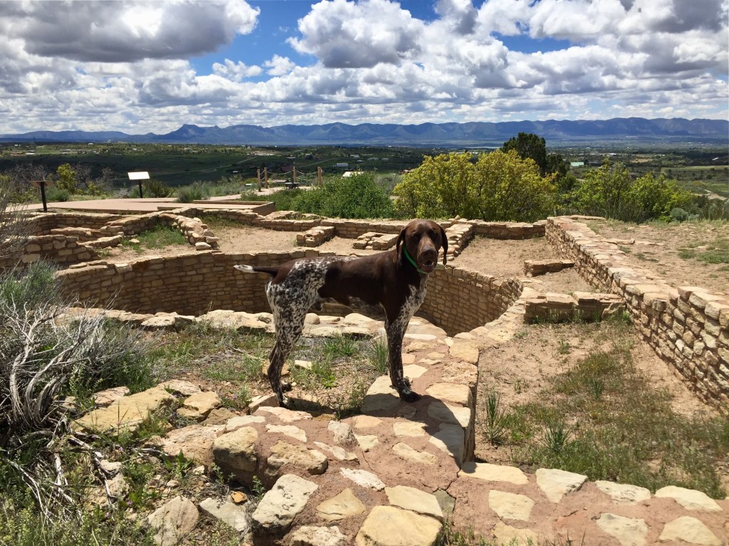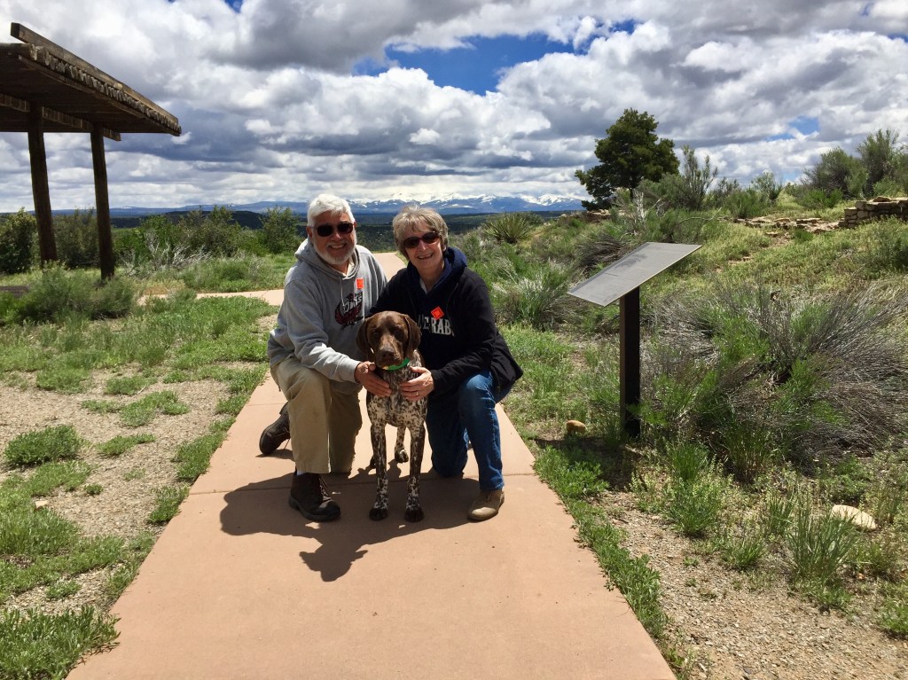 Having waited for the wind to ease off (a little), we set out for Dolores. Shortly after departure, I saw a couple of squalls moving north across the high plains. Like a racing tortoise, I tried as hard as I could to outrun it, but one of the little storms caught us and hailed all over us for 10-15 minutes. The hail was small, but still, I envied Jax in his covered trailer. No problem, keep pedaling. The storm moved on and so did we, all the way to the beautiful home of our hosts, Tony, Sharon and the two sweet German Shorthaired Pointers they have rescued. After a fun, GSP-filled evening and morning, Jax and I rolled to the Canyon of the Ancients Museum and then made the short remaining ride to Cortez, to position ourselves for a longer trek to Farmington, New Mexico.